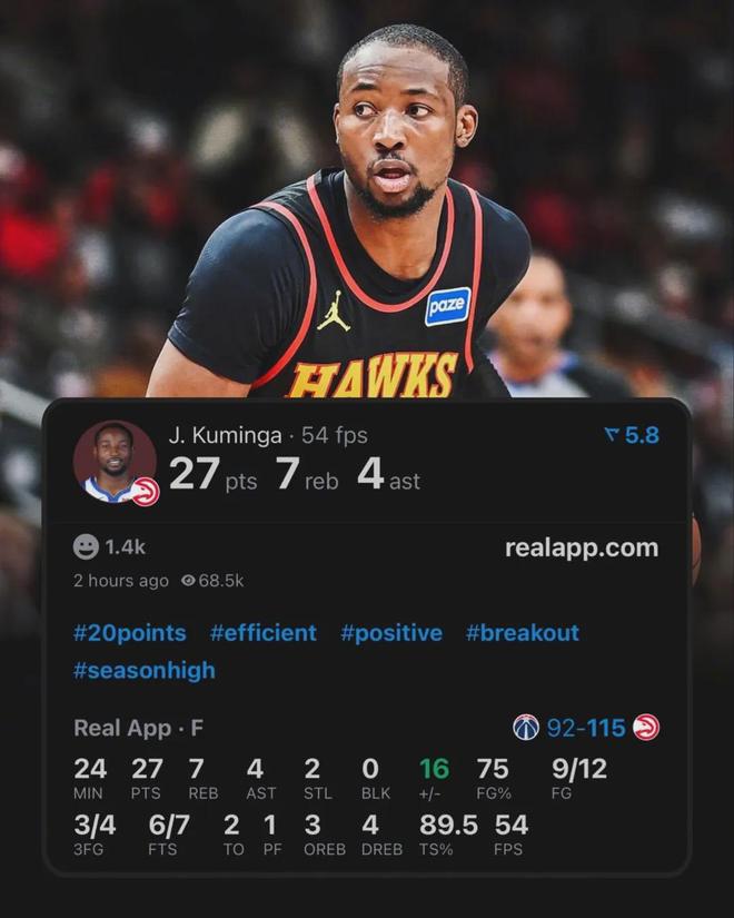 迎來(lái)老鷹生涯首秀的庫(kù)明加表現(xiàn)十分搶眼,替補(bǔ)出戰(zhàn)約24分鐘,投籃12中9,其中三分4中3,罰球7中6無(wú)比高效砍下27分外加7板4助2斷全面數(shù)據(jù),正負(fù)值+16,幫助新東家119-98輕松擊敗奇才。
