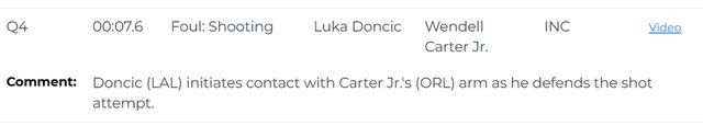 第三次漏判發(fā)生在距離比賽結(jié)束還有7.6秒。東契奇在防守小卡特的投籃時(shí),主動(dòng)用身體接觸對(duì)方手臂。這是一次漏吹的防守犯規(guī),小卡特把球打進(jìn),本該加罰一次,裁判沒有響哨,這次漏判是湖人獲利,魔術(shù)吃虧。