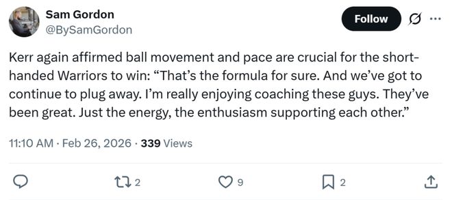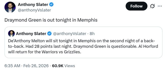 除此之外,追夢也在賽前突然因傷缺席,勇士隨隊記者Anthony Slater給出的原因是左下背部傷病管理。