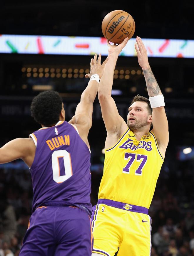 湖人:東契奇6記三分41分8籃板8助攻,詹姆斯15分6籃板5助攻,斯馬特13分,里夫斯14分,拉拉維亞11分。太陽:阿倫6記三分28分6助攻,吉萊斯皮6記三分21分,奧尼爾13分,鄧恩10分。
