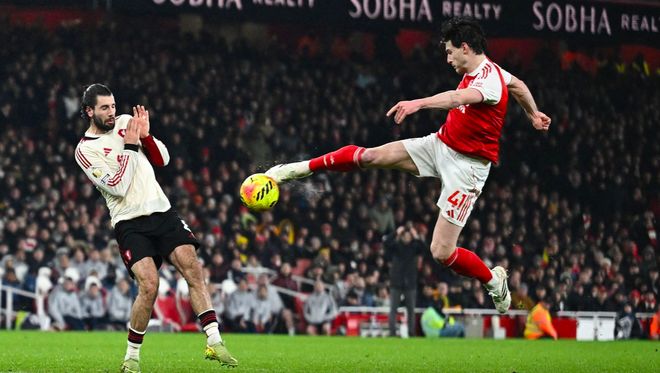 第43分鐘,廷貝爾的傳中被頭球解圍,賴斯跟進(jìn)一記凌空彈射,阿利松穩(wěn)穩(wěn)將球沒收。